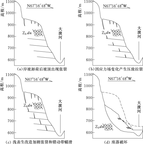 (2)第二阶段:浅生改造阶段。中更新世时期,大渡河河谷经历了快速的下切卸荷过程,河谷也由宽谷演化为峡谷。瓦山断块整体隆升与大渡河急剧下切,谷坡岩体临空与自重应力作用加剧是座落体形成的主要因素。中更新世末期,大渡河Ⅳ级阶地(相当于800m高程)形成后,经历了一个快速下切侵蚀的时期,直抵现代河床底部基岩面(相当于高程约580m),切蚀深度约220m。晚更新世以来在原来的基岩面上堆积了Ⅱ、Ⅲ级阶地及现代较大厚度的河床深厚覆盖层,而且在河谷两岸坡体一定深度范围内发育了大量卸荷裂隙,它们大多沿早先的陡倾坡外或陡倾坡内的结构面产生拉张变形或张裂,并以随机、间隔、阶状的方式出现,彼此并不贯通。