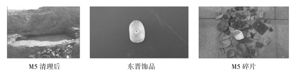 M5 简介:M5 坐西朝东。该墓为券顶砖室墓。墓室平面呈“刀”字形,采用三顺一丁砌法,墓底按“人”字形铺排。墓长4.85 米,宽1.62 米,高0.45 米。M5 共清理出文物1 件。该墓早期曾经被盗,出土了大量的碎片,有待后期整理。