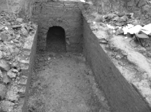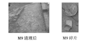 M9 简介:M9 坐西南朝东北。该墓为券顶砖室墓。墓室平面成“刀”字形,采用三顺一丁砌法,墓底按“人”字形铺排。墓残长4.04 米,宽1.43 米,残高0.4 米。共清理出3 件碎片。