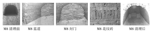 M8 简介:M8 坐西南朝东北。该墓为券顶砖室墓。墓室平面成“刀”字形,采用三顺一丁砌法,墓底按“人”字形铺排。墓长5.11 米,宽1.9 米。M8 共清理出文物6 件。