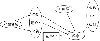 用户还可以把自己的公钥通过公钥证书发给另一用户,接收方使用CA的公钥PKCA对证书加以验证: