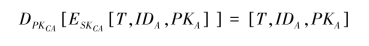 公钥证书的发放(产生)过程如图5-8所示,公钥证书即数字证书是由授权中心CA(Certificate Authority)颁发的。证书的形式为,其中IDA是用户A的身份标识符,PKA是A的公钥,T是当前时间戳,SKCA是CA的私钥。