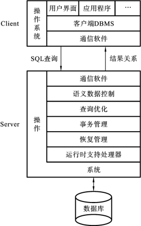 图2.9是一个Client/Server数据库系统体系结构。这个系统主要由两部分构成:客户端(Client)和服务器(Server)。我们把在这两端运行的数据库管理系统软件分别称为客户端DBMS和服务器DBMS。客户端将用户请求(SQL语言形态)递交给服务器,服务器获得结果后将结果返回给客户端。值得注意的是,尽管我们把这两端的数据管理软件都称为DBMS,但是它们在功能上还是有很大区别的,主要工作由服务器承担,所以它上面的数据管理软件要复杂得多。由于要在客户端和服务器通信,所以必须为它们配备通信软件。